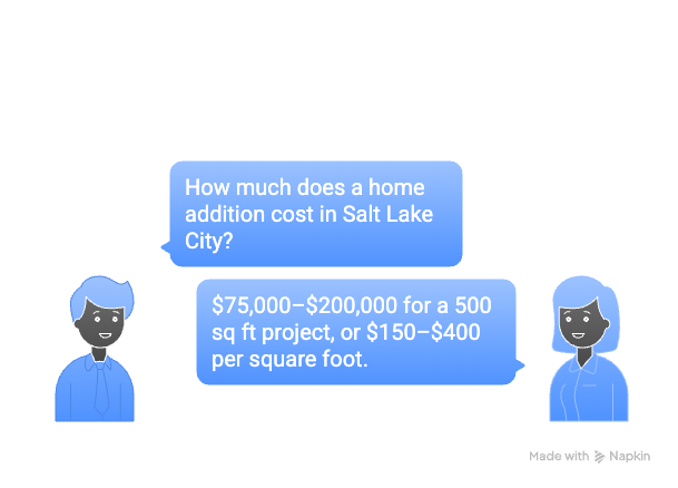 Q: What’s the average home addition cost in Salt Lake City? Home additions in Salt Lake City typically range from $150–$400 per square foot, depending on materials, complexity, and permits. A 500 sq ft addition costs $75,000–$200,000 on average.